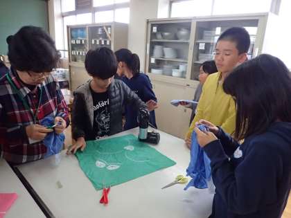伝統工芸の「鹿の子絞り」を体験しました。8名の講師の方々に来ていただき,丁寧に教えていただきました。子どもたちは伝統工芸で作る楽しさや難しさ,達成感を感じている様子でした。