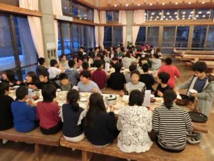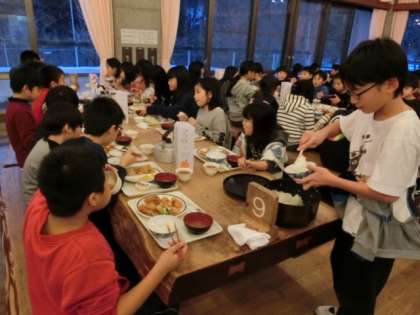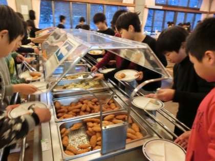 夕食は,カウンターでスープと桃ゼリーを受け取り,バイキングコーナーへ。
