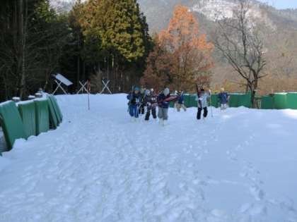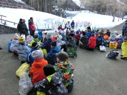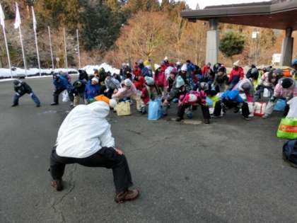 前広場でグループにわかれ,準備体操をしていよいよゲレンデに向かいます!