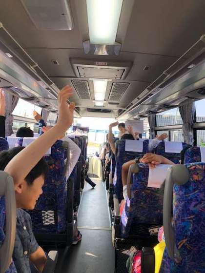 バスに乗り,広島への道中,広島クイズで盛り上がっています。