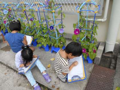 国語科の「おおきくなった」の学習で,生活科で育てているあさがおを観察して,絵や文でかきました。