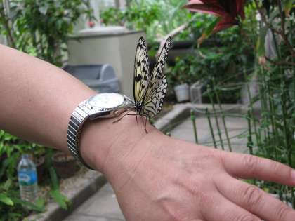 「チョウの家」では、先生の手にチョウチョウがとまりました。