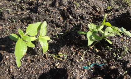 学校の畑に行ってみると,ヒマワリがぐんぐんそだっていました。