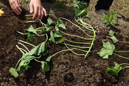 はたけに,さつまいも,らっかせい,トマトなどの なえを うえはじめています。