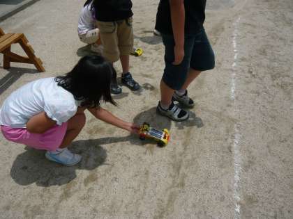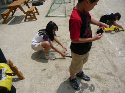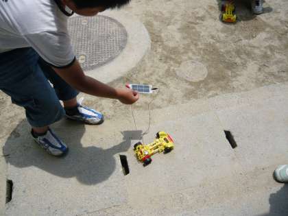 4年生の理科「電池の働きを調べよう」の学習で、ソーラーカーづくりをしました。光電池を装着した車に太陽光を当て、走るかどうかを確かめました。