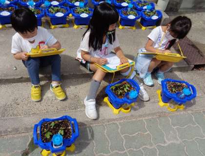 あさがおの芽がでてきました。葉っぱの形や模様,手触り,においなどを観察カードにかきました。「ハートのかたちみたい」とか「ちょうちょのかたちににているよ」などと話していました。