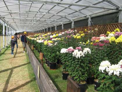 菊花展では,白・黄色・紫と菊が美しく咲いていました。