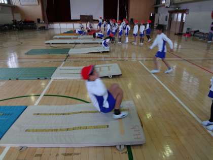 3年生は体育でマット運動をしています。今できる技の連続に挑戦したり,新しい技に挑戦したりします。2年生の時にはできなかった技ができるようになった子どもも多く,みんな意欲的に学習しています。