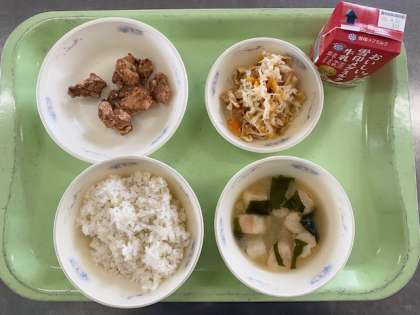 今日の給食は、麦ごはん、鶏肉の塩こうじあげ、切干大根の煮つけ、みそ汁、牛乳でした。