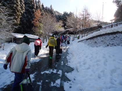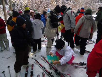 さあ、ミニゲレンデに到着すると、スキー靴に履き替え、今度はスキー板を合わせます。
