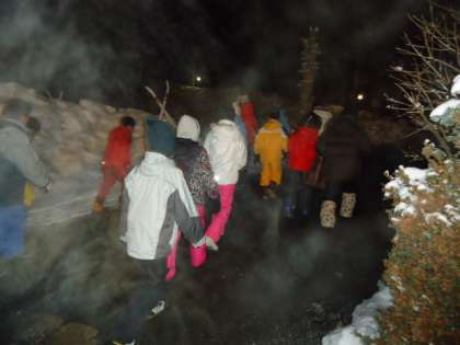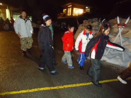 北山民家というわらぶき屋根の昔の家の中で火を焚き、いろりを囲みました。