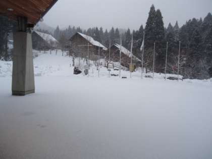 宿舎の玄関前も一面の雪。ミシミシを気持のよい雪の感触があります。