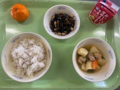 献立は、麦ごはん、鶏肉と野菜の煮つけ、ひじき豆、みかん、牛乳でした。