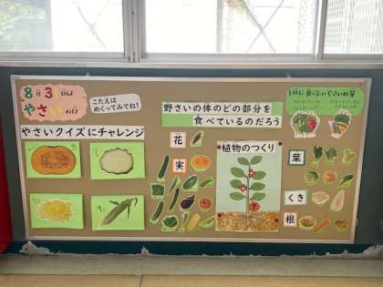 8月31日は語呂合せで「やさいの日」です。掲示物を見ながら、すきな野菜や給食で食べたい野菜をたくさん教えてくれました。理科の学習で、植物のつくりや実のでき方を学習している学年もあり、学びが身近な野菜とつながって少しでも興味を持てればと思います。