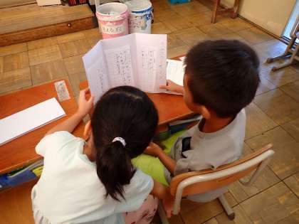 国語科の「うみの かくれんぼ」の単元ではかくれんぼが上手な生き物を本で調べて、かくれかたやからだの工夫などを交流しました。海だけではなく、はらっぱや木の枝、どうくつなどいろいろなところに隠れている生き物について興味をもって交流していました。