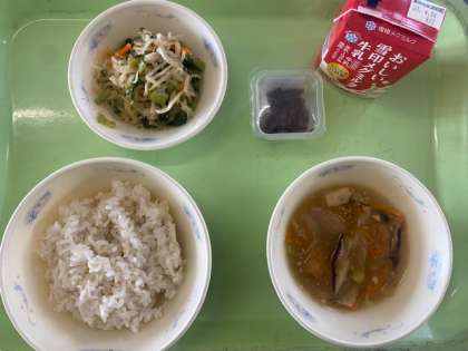 献立は、麦ごはん、厚揚げの野菜あんかけ、切干大根のごま煮、しば漬、牛乳でした。