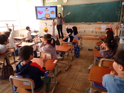 ALTのバーリー・エレナ先生と一緒に外国語の授業に参加してくれ、自校紹介やクイズで楽しませてくれました。また、一緒に歌を歌ったり、ビンゴゲームをしたりして仲良しになることができました。