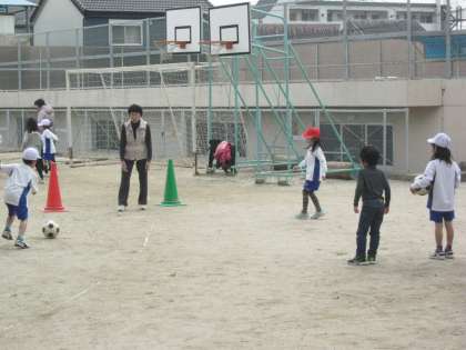 コーンをゴールに見立てて,ボールをコントルールして,蹴る練習をしています。