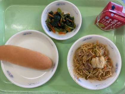 11月7日(火)の献立は、小型コッペパン、ソース焼きそば、小松菜のごま油いため、牛乳でした。