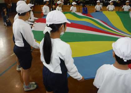 『いろとりどり』で体をほぐし、玉入れで必死の一撃!たくさん入っていましたね!