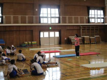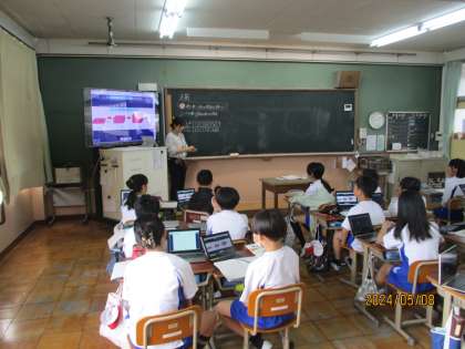 マットの学習ではGIGA端末を使い、学習を振り返っています。算数の学習では比例の学習に取り組んでいます。