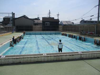 今日からプールでの学習が始まりました。低水位での水遊びです。