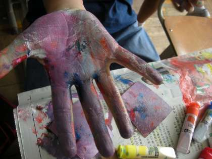 「色がひびき合うとはどういうことか」ということから始まった図工の時間。「グラデーション!」「色の組み合わせを意識して混ぜる!」「混ぜ具合を変える?」など、たくさんの意見が出ました。どんなことができるかを想像している時点でワクワクしている子どもたち。いつもは筆を使う絵の具ですが、紙に直接のせた絵の具を指でぐるぐると混ぜ、さまざまな色の組み合わせを楽しんでいました。手がどんどんと色鮮やかになり、芸術家のような手でどんどんと作品を生み出す姿が印象的でした。