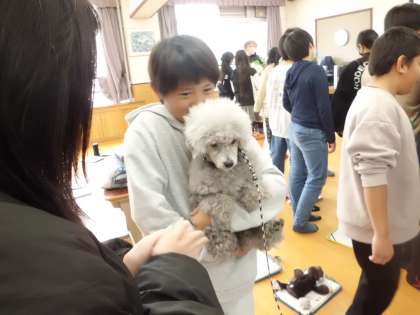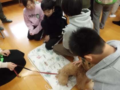 今日は、総合的な学習の時間で獣医の方、動物愛護センターの方々に来ていただきました。動物とのかかわり方や、聴導犬などの介助犬がどのような仕事をしているのか教えていただきました。