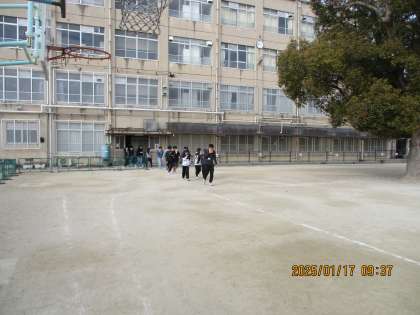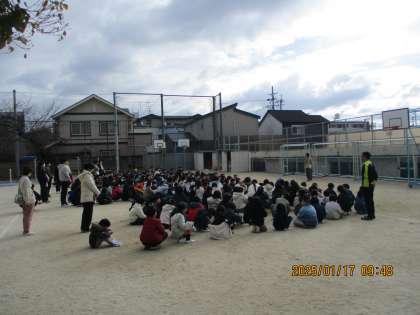 阪神・淡路大震災から今日で30年です。大きな地震の後、給食室で火災が発生したという想定で、避難訓練を行いました。みんな真剣に訓練に取り組んでいました。