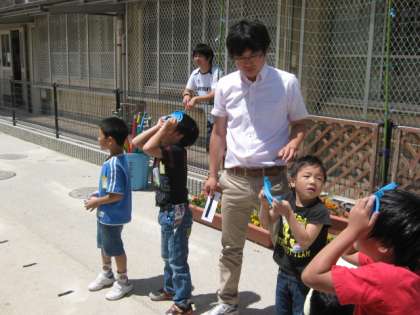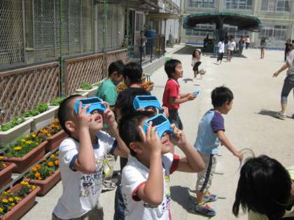 太陽面を金星が通過する様子を,休み時間に子どもたちが観察していました。