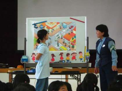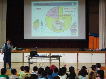 かわりに,体育館にて交通安全についての指導を,伏見警察署の署員さんにしてもらいました。