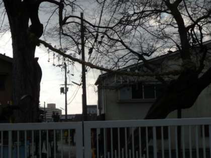 学校の校門前に大きな神木があり,しめ縄が巻かれています。