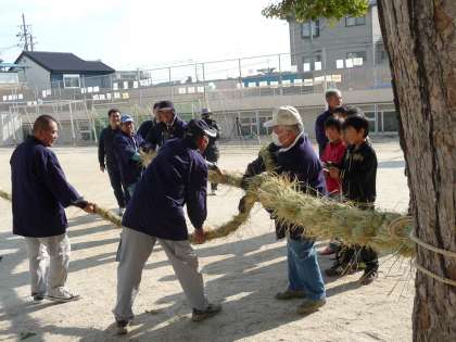 毎年,学校のクスノキを使って新しいしめ縄を作っています。