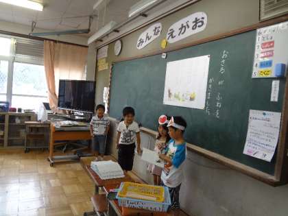 「おさるがふねをかきました」を役割分担を決めて,音読しました。みんなの前で発表もしました。