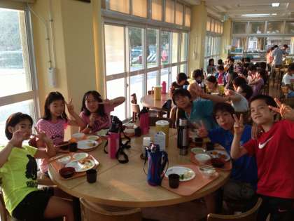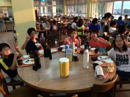 ふれあいホールでバイキングの夕食。おなかいっぱい食べてみんな大満足です。