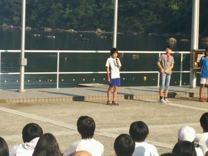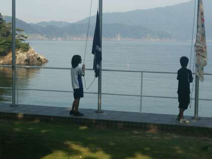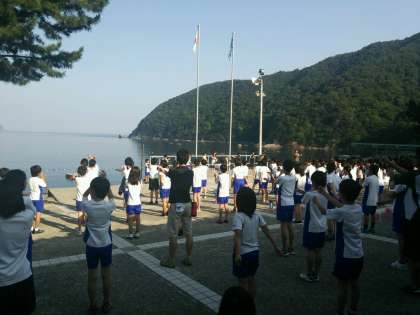 爽やかな朝です。抜けるような青空と磯の香りに包まれて,朝の集いをしました。