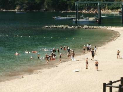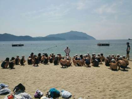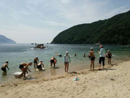 砂浜の続く浜辺で,泳いだり,水中を見ることができるフロートを使って海の中をのぞいたりしています。