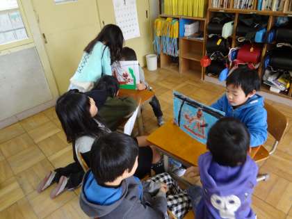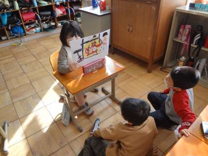 たぬきの糸車のお話に自分で言葉をつけたして紙しばい風に紹介しあいました。