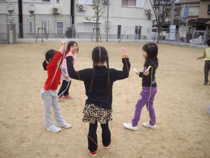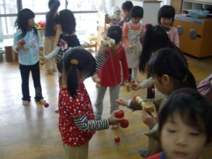 1月に2年生に教えてもらった、こま、けん玉、なわとびを改進保育所のおともだちに、教えてあげました。