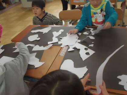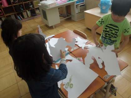 図画工作ではさみの学び方を学び,画用紙を切ってたまたまできた形を楽しみました。