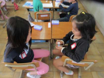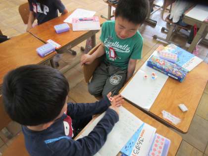 4や5のかずをいくつといくつにわけられるか,友だちとゲームをしながら考えました。