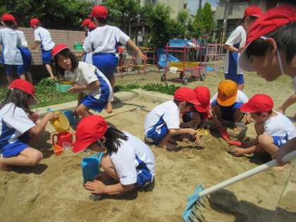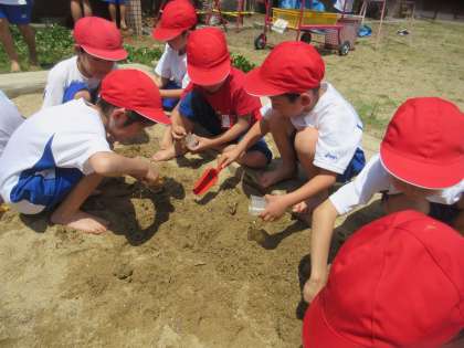 プリンカップを型にして,砂でおかしをつくったり,スコップで大きなお山をつくったり,それぞれが楽しんで活動していました。