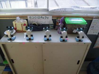 教室の前の理科コーナーではみんなが顕微鏡をのぞきこんで感動していました。
