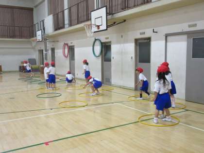 二クラス合同で,とびくらべをしました。フラフープの島を落ちないように跳び移ったり,ゴム紐を跳び越えたりくぐったり,舞台の上から高くジャンプしたりしました。全身を使って大きく跳ぶことを頑張りました。