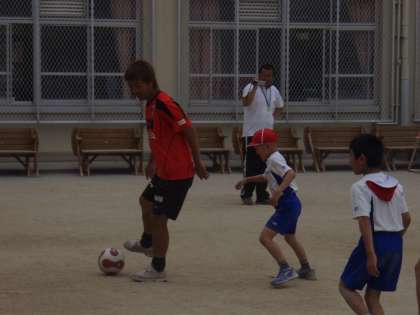 6月7日(月),Jリーグ1部リーグで活躍する京都パープルサンガより,柳沢敦選手,中山博貴選手にご来校いただき,サッカー教室を開いていただきました。