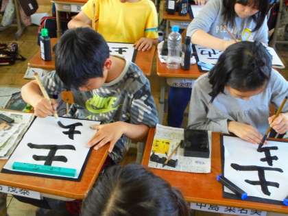 5年生になって1回目の書写の授業で『土地』という字を書きました。4年生までの書写の学習をふりかえり,始筆と終筆にこだわってかきました。