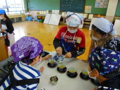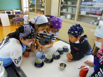 「少し苦いかな…」と言いながらも,きゅうすで入れたお茶を味わう子どもたちの姿が印象的でした。