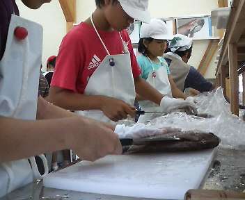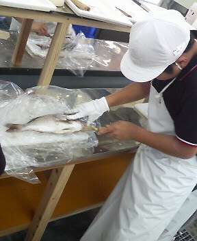 鯛をさばいています。うろこをとったりも自分でしています。鯛と格闘中です。
