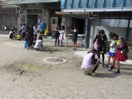 雨上がりの日に,運動場で雨水の流れた様子を観察し,自然の中で見られる「流れる水のはたらき」を確かめました。