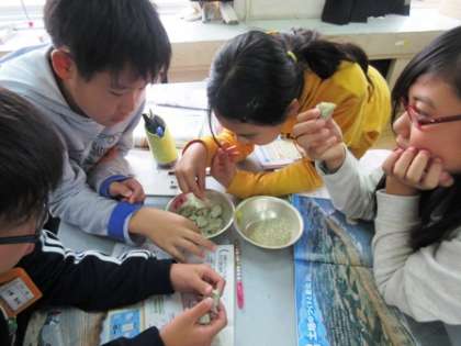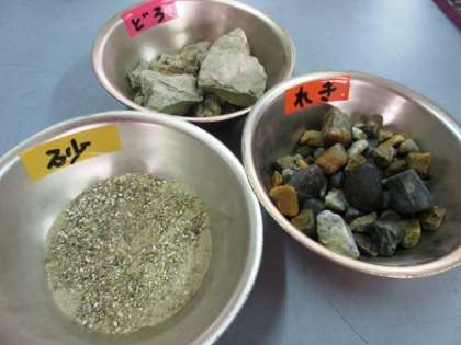 縞模様に見える土地の様子を標本で調べ,『礫(れき)・砂・泥』を実際に手にとって観察しました。